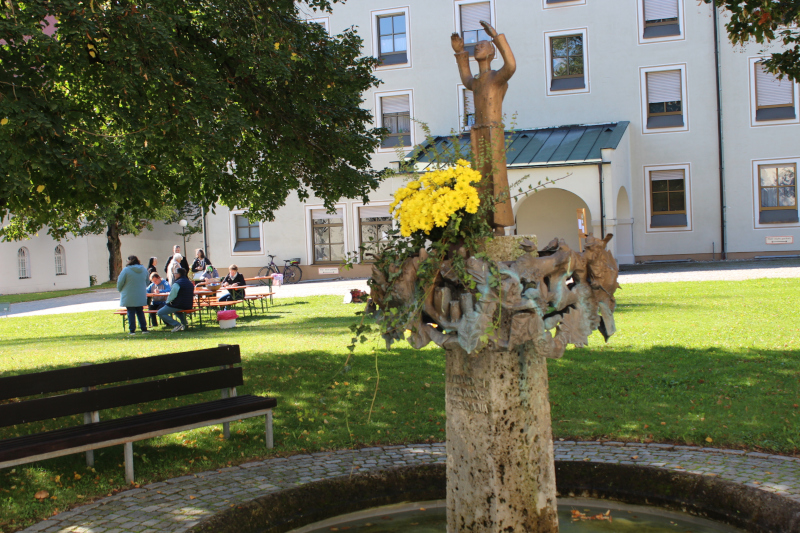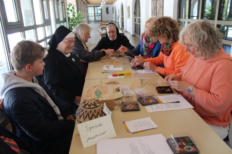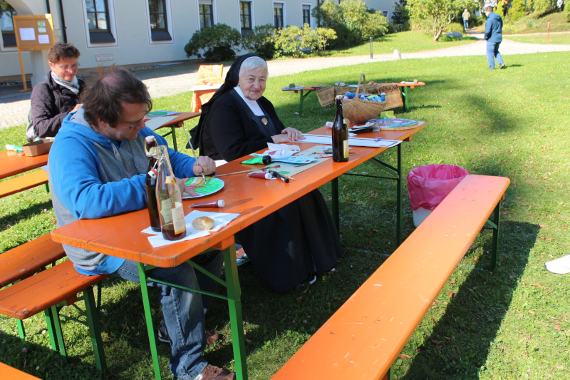 Die zahlreichen Angebote von kreativ über meditativ, von Gespräch bis hin zum Lobpreis in der Kapelle boten für alle eine Chance, für sich etwas zu entdecken. Man konnte sich für kreatives Malen zum Sonnengesang, Knüpfen von Rosenkränzen, kunterbunte Bastelei, Tanzen oder für eine meditative Wanderung, Besinnung zum Thema „Wasser unser kostbarer Schatz“ bzw. dem Zuhören von Klanggeschichten über Franziskus. Dazwischen bestand die Möglichkeit, sich im Begegnungscafé bei einer Tasse Kaffee und Kuchen aus der Klosterbäckerei zu erfrischen und miteinander ins Gespräch zu kommen.